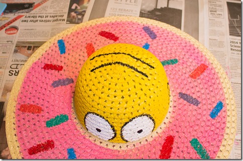 First I painted the top of the hat yellow. Then I painted a wide pink ring around the brim of the hat. I wanted my frosting to be pink because Homer loves pink frosted doughnuts. You can make your frosting whatever color you like.